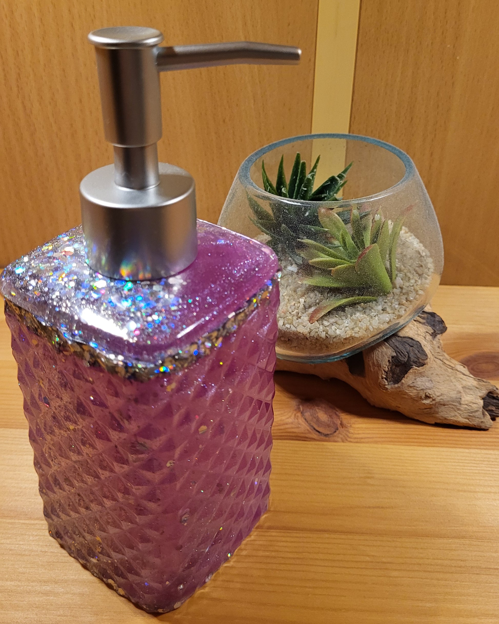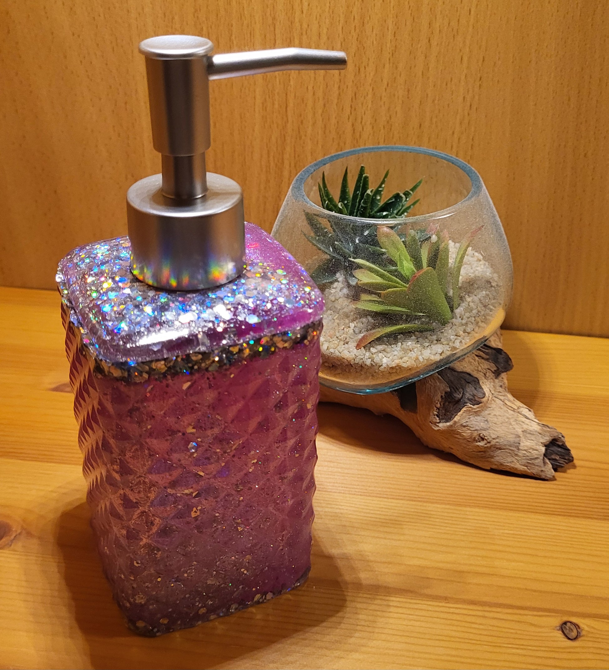 Schöner lilaner Seifenspender mit Glitzer und silbernen Pumpkopf.
